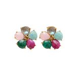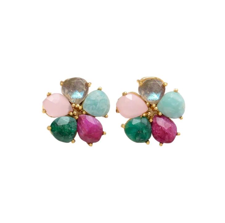 Aretes de diseño y exclusivos de Mestiza Joyas compuesto por 5 piedras formando una especie de flor.