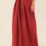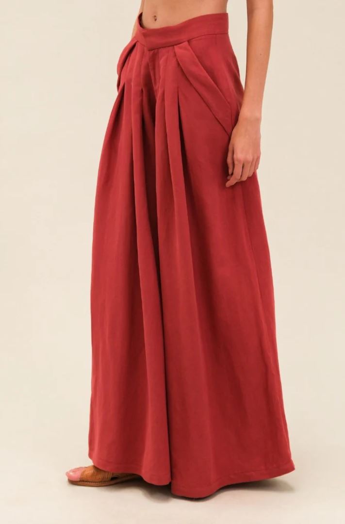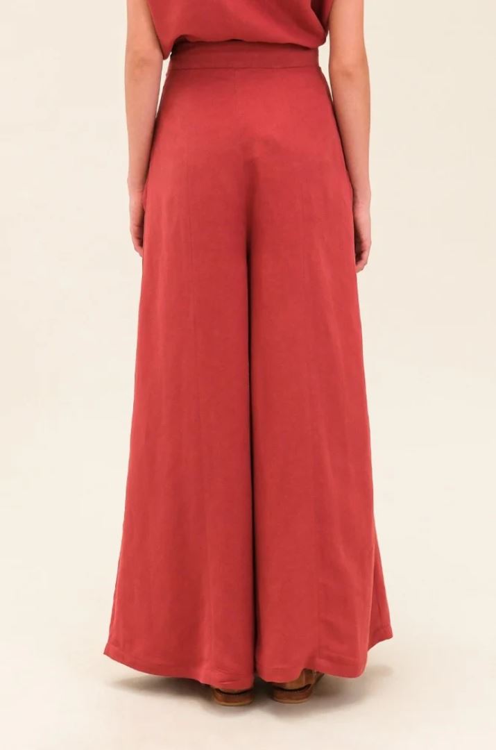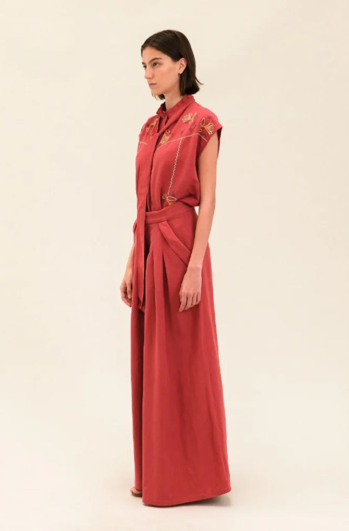 De cintura alta con silueta línea A y bolsas externas al frente. Tiene pretina interna y cierra al frente con cierre, broches y botón.