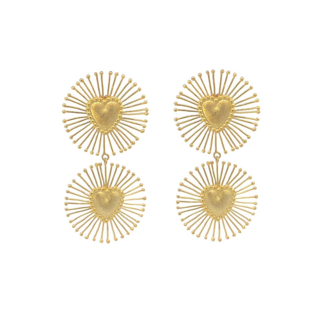 Los pendientes Doble Sagrario son una narración artesanal que se puede llevar puesta. Hechos a mano en Colombia con bronce chapado en oro de 24 quilates y sellados con una laca cataforética para un brillo duradero, cada pendiente está engastado con piedras en bruto, un guiño a la belleza de la imperfección. Miden 10 cm de largo y pesan aproximadamente 18 gramos cada uno, lo que los convierte en una pieza atrevida y elegante. Además, cada par está elaborado de forma única, con sutiles variaciones que reflejan el arte que hay detrás.
