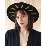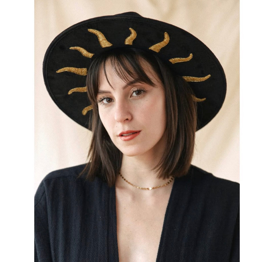 Sombrero de gamuza con siete rayos bordadas a mano en tonalidades doradas. Elaborado por las mujeres de la comunidad de San Pedro Arriba en el Estado de México, México.