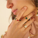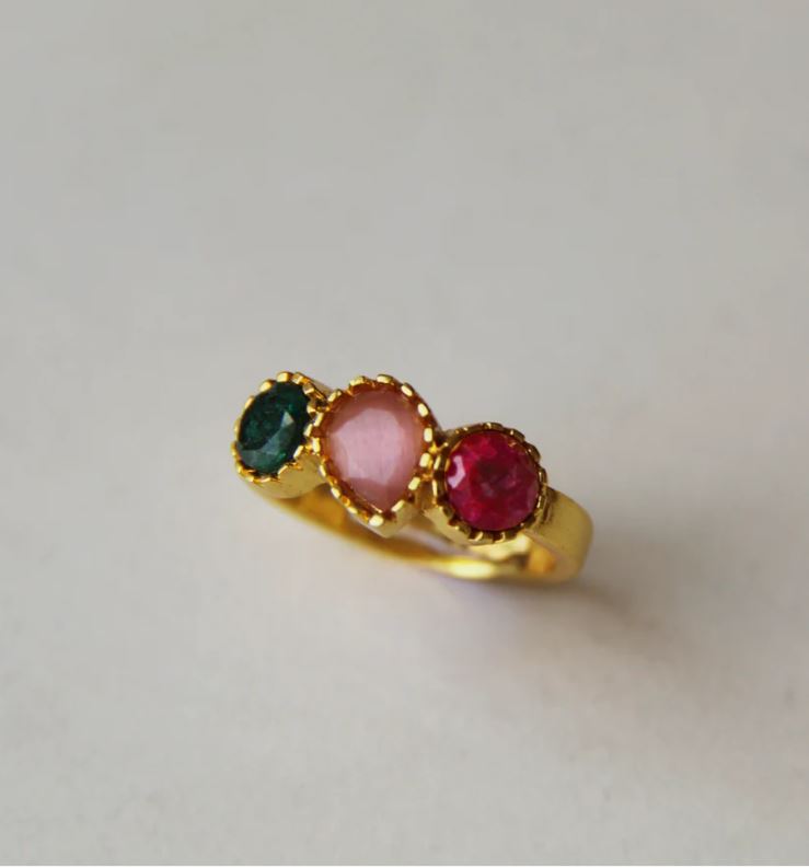 Diseño exclusivo con tres piedras de calcedonia en tonos verde, rosa y rubí.
