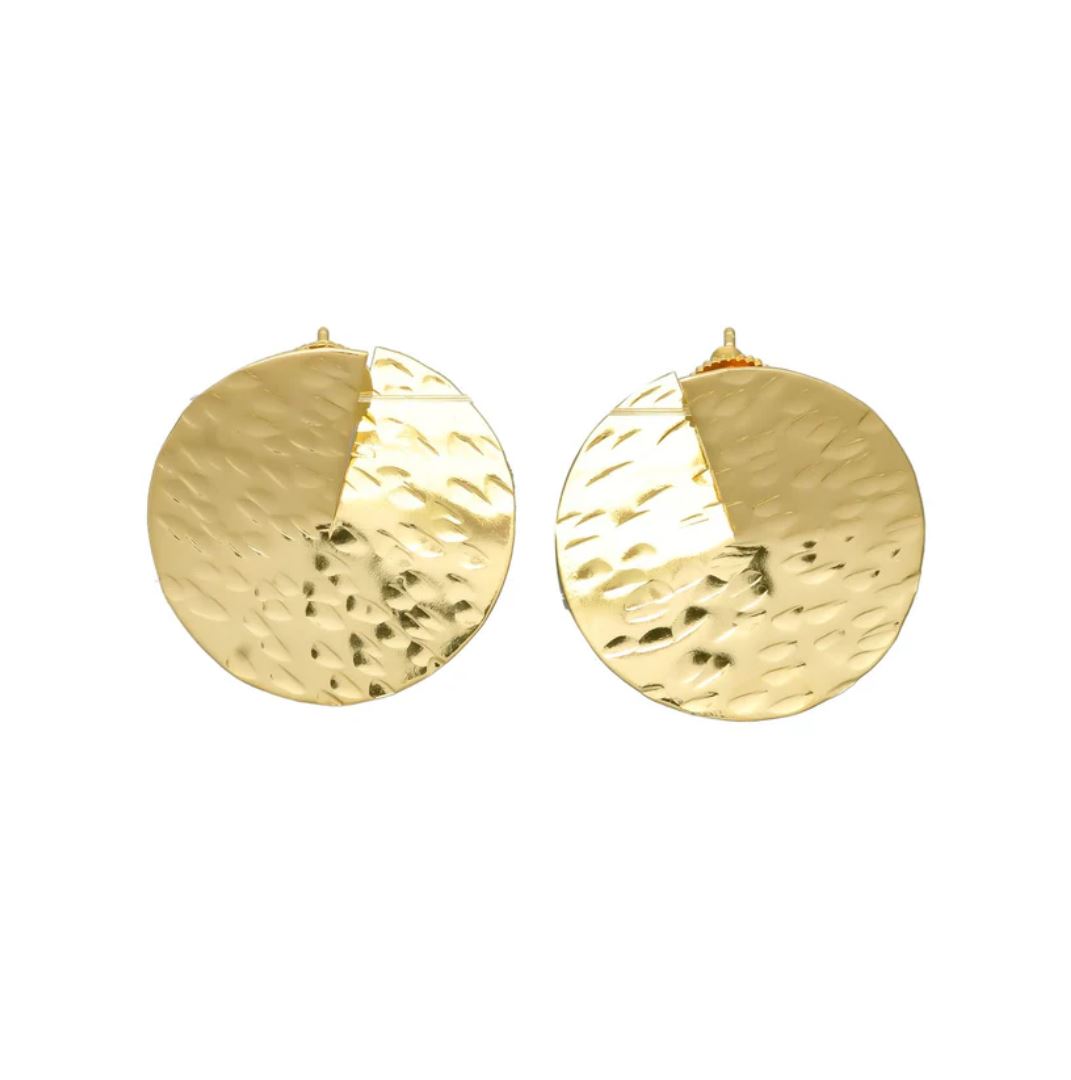 Aretes de diseño y exclusivos de Mestiza Joyas compuestos por un círculo dorado amartillado de 3 cm de diámetro.