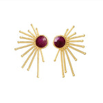 Son unos pendientes exclusivos de Mestiza Joyas compuestos por una piedra que va situada en el centro y una forma de abanico dorado que envuelven la piedra. Es un diseño muy ligero y cómodo de llevar.