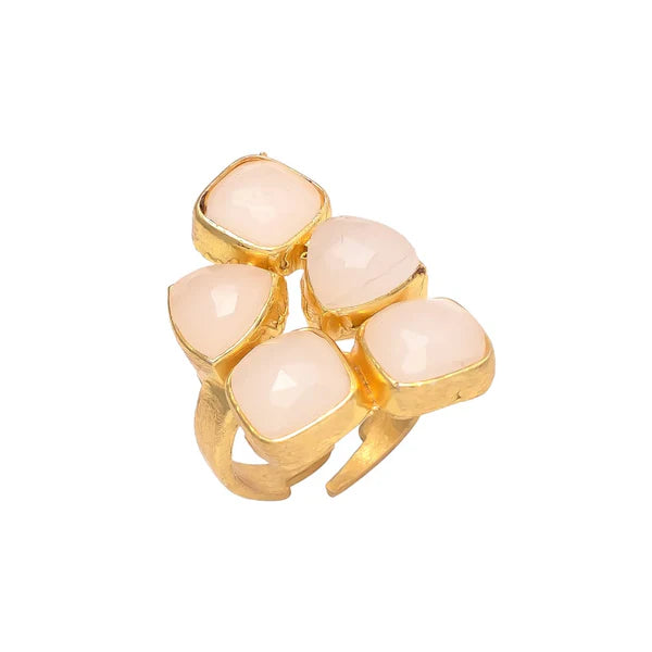 Este anillo tiene un diseño con 5 piedras piedras naturales con formas diferentes, 3 de ellas son cuadradas y 2 triangulares.