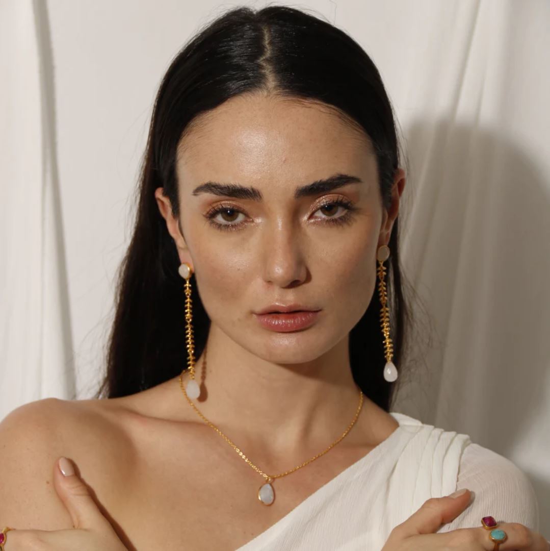 Estos aretes son un diseño hermoso formado por una cadena en forma de pequeños capullos de flor y 2 pequeñas piedras naturales en los extremos. La piedra superior redonda y la inferior ovalada. Son unos aretes elegantes que nunca pasan de moda debido a que favorecen cualquier outfit.