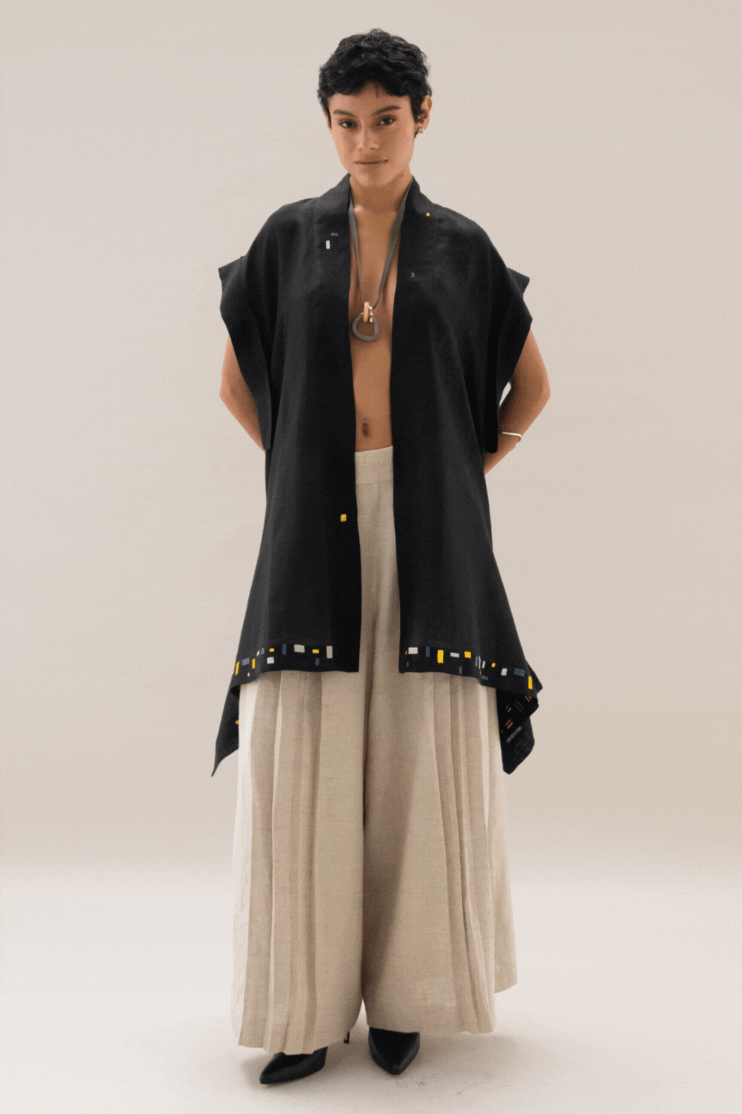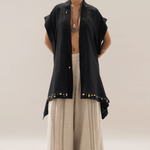 Ensamble largo con solapa, tiras montadas simulando mangas y aberturas laterales con caída irregular.