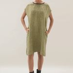 Vestido corto con silueta relajada, caja de cuello redonda, bolsillos ocultos y aberturas en los laterales.