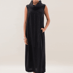 vestido largo 3/4, con silueta en linea "A", cuello de tortuga y bolsillos ocultos.