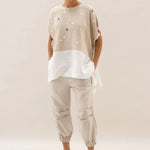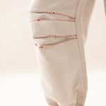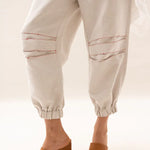 Pantalón de corte recto con elástico en tobillos y trasero de la pieza, pretina lisa en el frente, detalles alforzados en rodillas y bolsillos de cargo en la parte trasera.