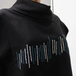 Blusa largo cadera en forma de rectángulo, cuello de tortuga, costadillos, tiras montadas simulando mangas y aberturas al frente.